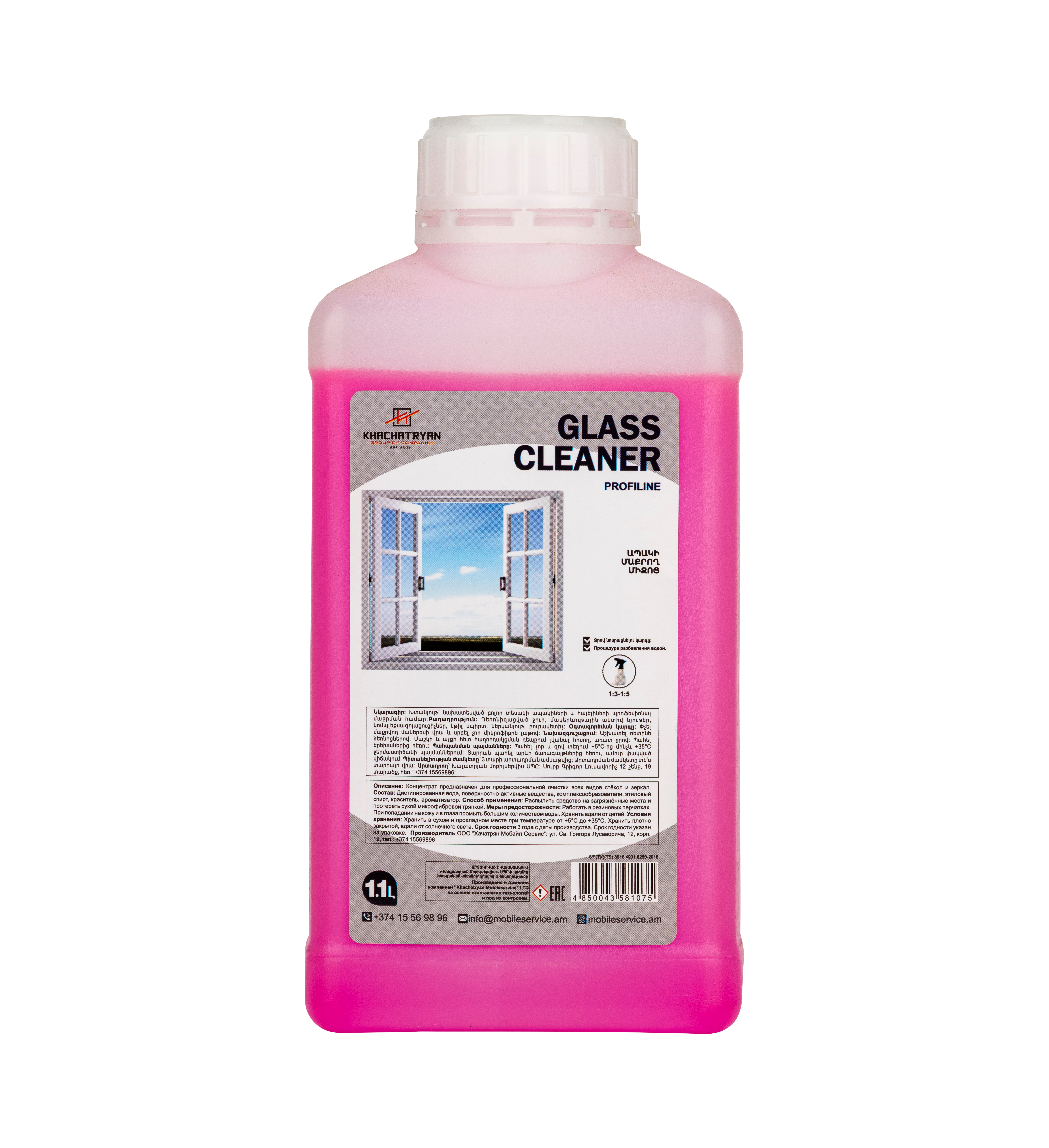 Խտանյութ՝ նախատեսված բոլոր տեսակի ապակիների եվ հայելիների պրոֆեսիոնալ մաքրման համար: